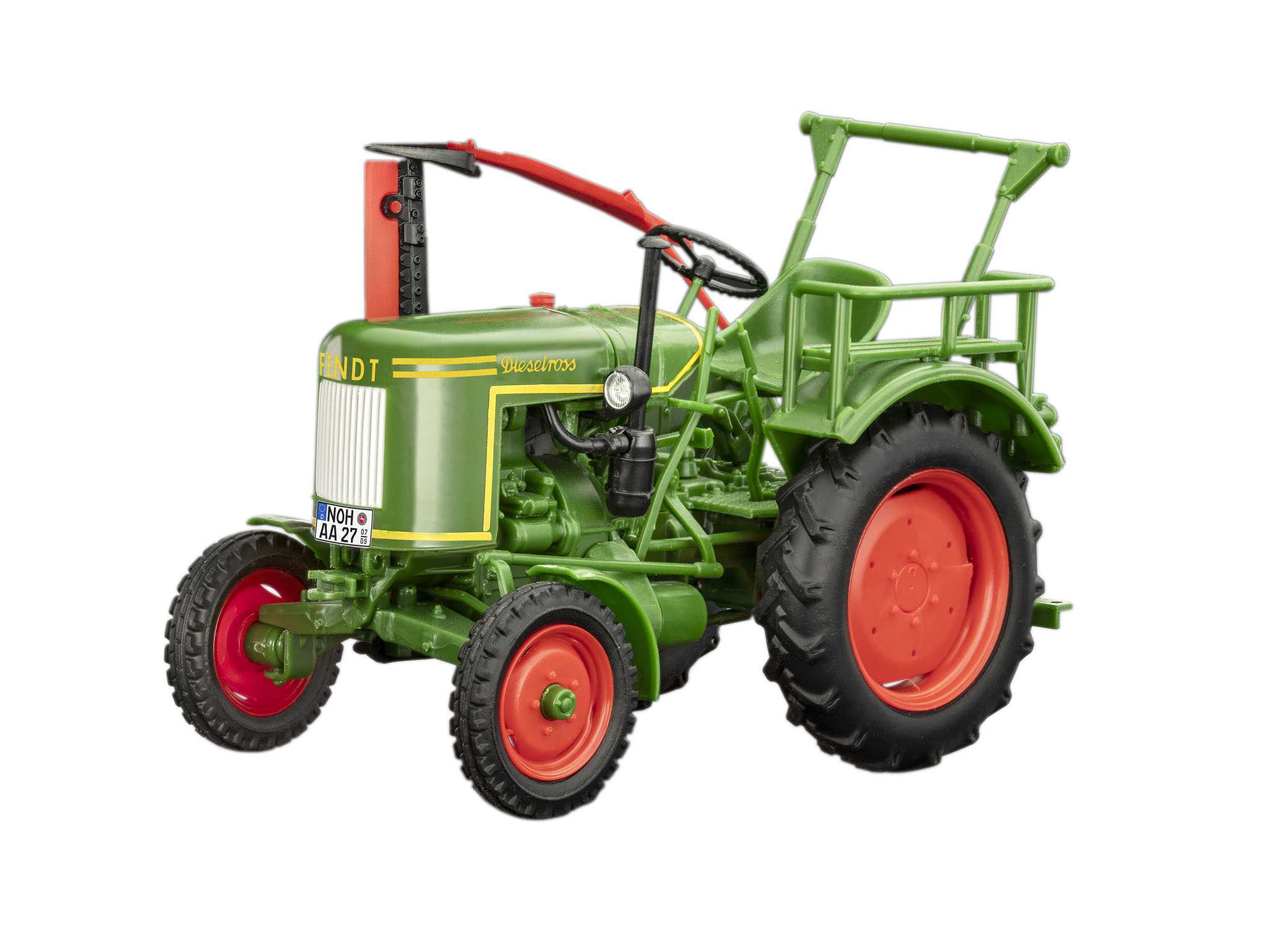 Model F20 Dieselrß byl důležitým milníkem v historii zemědělství 50. let 20. století. Jako nový traktor střední třídy přinesl na pole výkon 20 koní se svým vodou chlazeným jednoválcovým motorem o objemu 1,5 litru – robustní, spolehlivý a inovativní. Jméno „Dieselroß“ symbolizovalo kvalitu a technickou přesnost z tehdejšího Německa i dnes. S tímto modelem si domů přinesete kus technologické historie – dokonale implementovaný pro stavbu modelů.