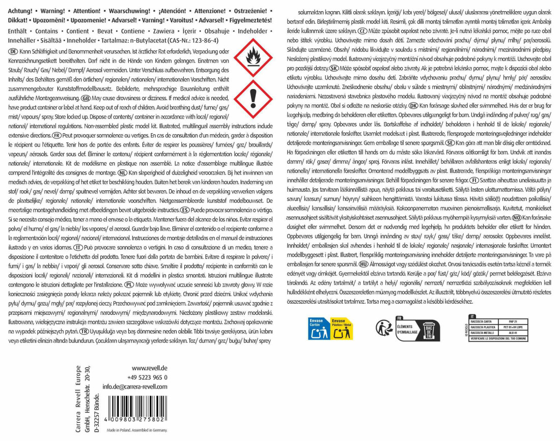 Instrukcja użycia: Farba akrylowa na bazie wody. Przed użyciem dokładnie wymieszać. Nakładać pędzlem lub natryskiem na suchą, czystą powierzchnię. Podłoże niepalne, szybko schnie - nie nadaje się do malowania po 1 godzinie, całkowicie wysycha po 2-3 godzinach, w zależności od grubości warstwy. W razie potrzeby rozcieńczyć wodą. Użycie nieodpowiedniego rozcieńczalnika może zniszczyć farbę! Czyścić rozcieńczalnikiem Revell Aqua Color Clean. Do natrysku zaleca się rozcieńczenie maksymalnie 20-25%. Pędzel i narzędzia natychmiast po użyciu spłukać wodą. Po użyciu szczelnie zamknąć pojemnik. Po otwarciu zużyć jak najszybciej, farba wysycha na powietrzu. Chronić przed mrozem. Zawiera mieszaninę 5-chloro-2-metyloizotiazol-3(2H)-onu i 2-metyloizotiazol-3(2H)-onu z chlorkiem magnezu i azotanem magnezu. Może powodować reakcję alergiczną.