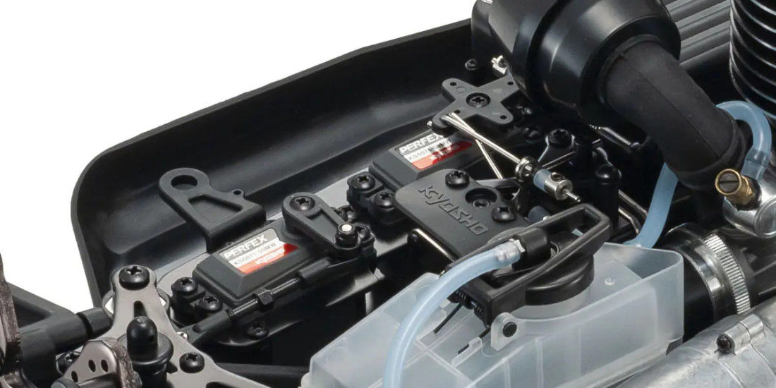 Inferno Neo 4.0 jest wyposażony w nowe serwa układu kierowniczego i przepustnicy Kyosho KS5071-09MW. Te serwa o wysokim momencie obrotowym posiadają metalowe przekładnie i zapewniają błyskawiczną reakcję. Serwo przepustnicy steruje również hamulcem dwutarczowym, zapewniając dużą siłę hamowania.