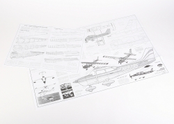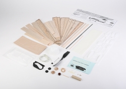 Zestaw zawiera: wycięte części z balsy, belki z balsy, wycięte części ze sklejki plastikowej, części modelu prasowane próżniowo (pokrywa kabiny, pokrywa silnika, osłony kół...), plastikowe śmigło z wałem i głowicą, gumkę recepturkę (5x1 mm), stalową linkę do podwozia i innych małych części, koła, papier pokryciowy, uchwyt i wahacz do modelu na uwięzi, arkusz mokrych kalkomanii, plan budowy.