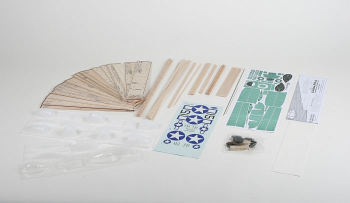 Zestaw zawiera: wycięte części z balsy, belki z balsy, części modelu prasowane próżniowo (osłona silnika, silniki...), przezroczyste listwy octanowe kokpitu i bocznych „wypukłości”, plastikowe koła, stalowy sznurek do podwozia i inne drobne części, papier pokryciowy, arkusz mokrych kalkomanii, plan budowy.