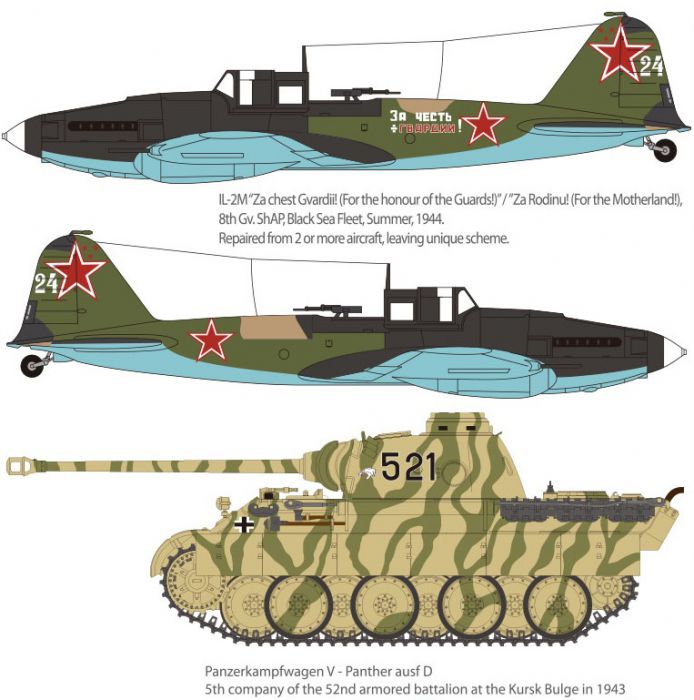 – Zestaw zawiera plastikowe formy do radzieckiego myśliwca Ił-2M i niemieckiego czołgu Pantera D