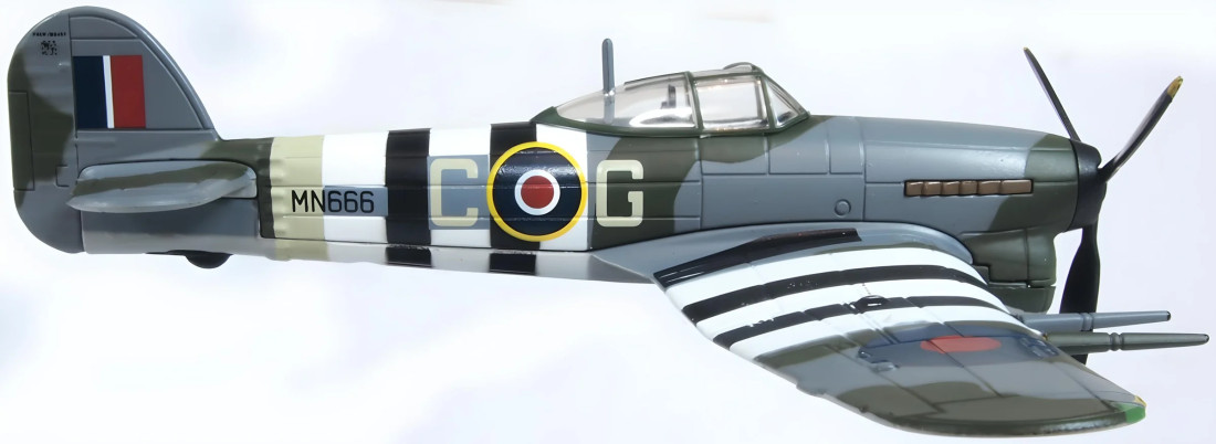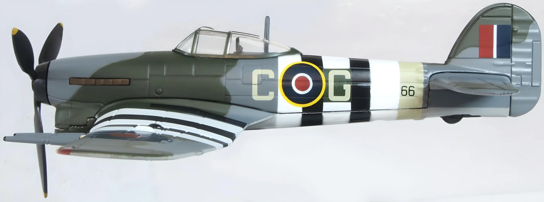 Metalowy model kolekcjonerski brytyjskiego myśliwca Hawker Typhoon Mk.I z okresu II wojny światowej. Model sprzedawany jest ze stojakiem.