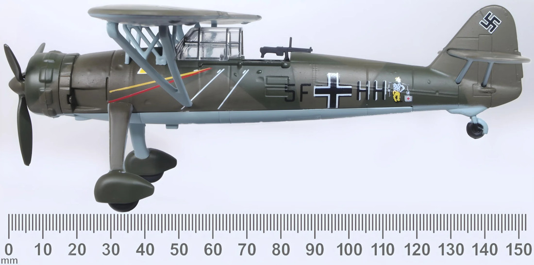 Metalowy model kolekcjonerski niemieckiego samolotu rozpoznawczego Henschel HS126 z II wojny światowej. Model sprzedawany jest ze stojakiem.