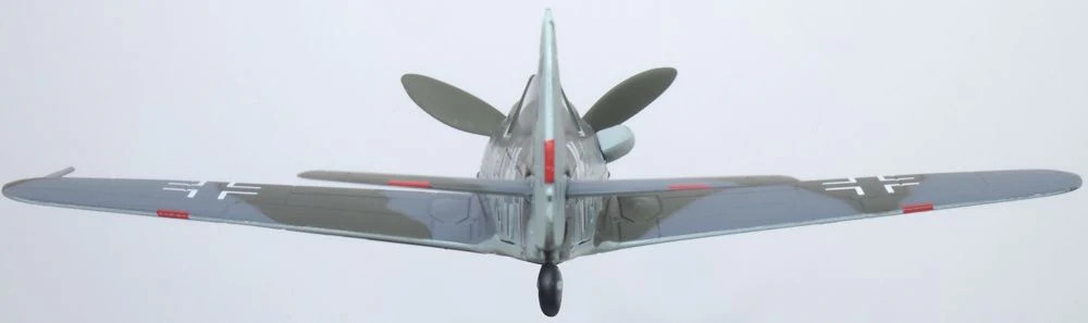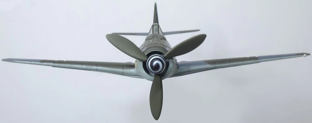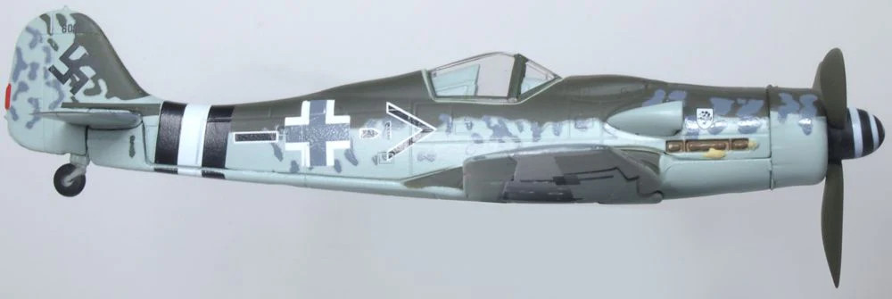 Metalowy model kolekcjonerski niemieckiego myśliwca Focke-Wulf Fw 190 D-9 z II wojny światowej. Model sprzedawany jest ze stojakiem.