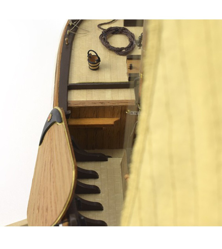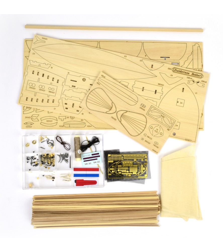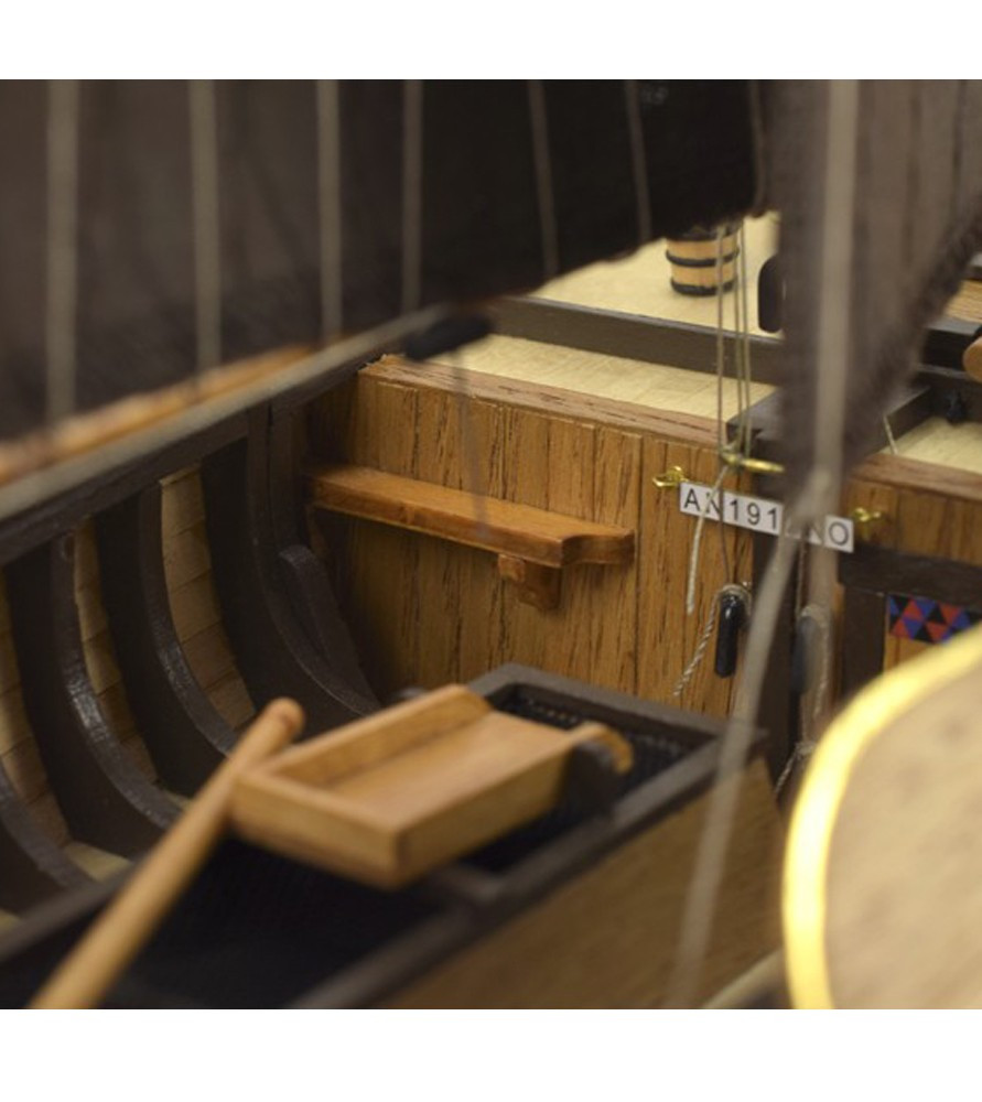 Zestaw zawiera elementy ze sklejki wycinane laserowo, elementy z litego drewna, pasy poszycia kadłuba, akcesoria z mosiądzu i odlewanego metalu, elementy fototrawione, nici, szyte bawełniane żagle, flagę oraz części do zbudowania stojaka.