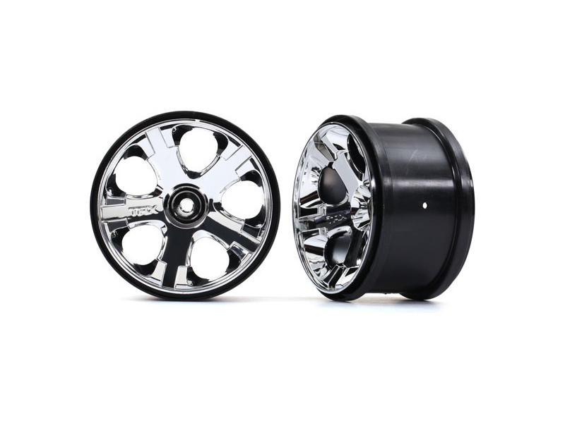 Felgi tylne Nitro, przednie Electro All Star chromowane na wysoki połysk. Średnica tarczy 71 mm (2,8"), szerokość 48 mm. Do samochodów Traxxas Rustler, Stampede, Sport SE, Jato, Monster Jam. Hex 12 mm.