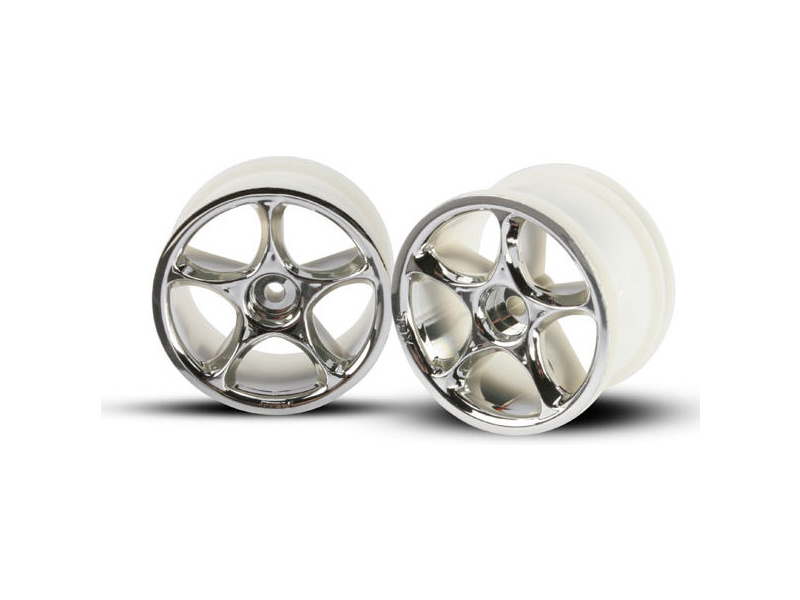 Tylne felgi chromowane Tracer. Średnica tarczy 56mm (2.2"), szerokość 38mm. Do samochodów Traxxas Bandit.