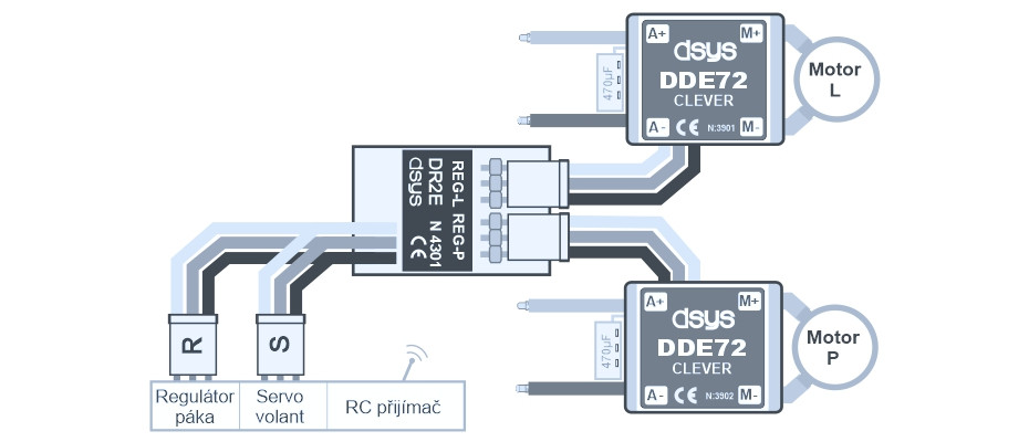- DR2EW miksuje sygnały kanału przepustnicy kontrolera (drążek) i kanału kierunku (koło sterowe, ster kierunku).