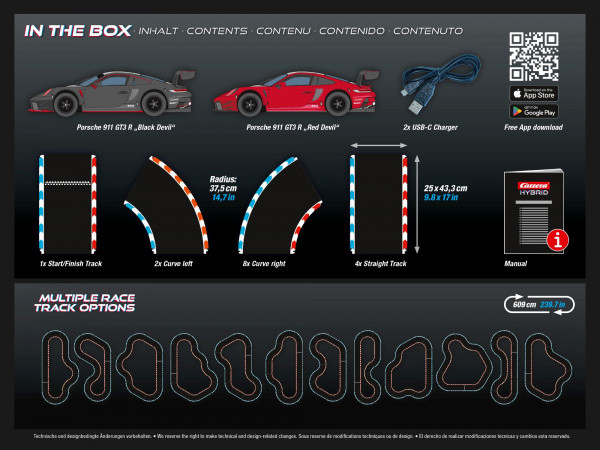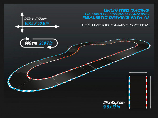 Autodráha Carrera Hybrid dlouhá 6,09 m s auty Porsche 911. Závodit může až 16 aut najednou, ovládaní pomocí aplikace, nastavení aut pomocí AI. Jezdit a předjíždět lze jak na dráze. tak i mimo ni.