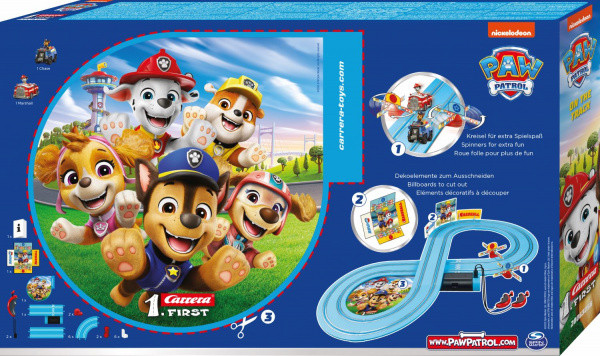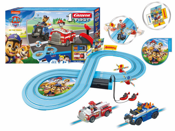 Autodráha Carrera 1. First dlouhá 2,4 m s auty Tlapková patrola Chase a Marshall. Autodráha, která je vhodná pro děti od 3 let, obsahuje rovinky, zatáčky, točící vrtule, ovladače a dekorace s tématikou Tlapková patrola. Autodráha se napájí prostřednictvím 4 malých monočlánků typu C.