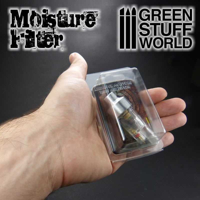 Kompaktowy filtr powietrza Green Stuff World z separatorem wody do pistoletów natryskowych. Filtr powietrza jest przykręcony bezpośrednio do wlotu sprężonego powietrza pistoletu. Dzięki temu pistolet lepiej leży w dłoni, a nadgarstek jest całkowicie rozluźniony.