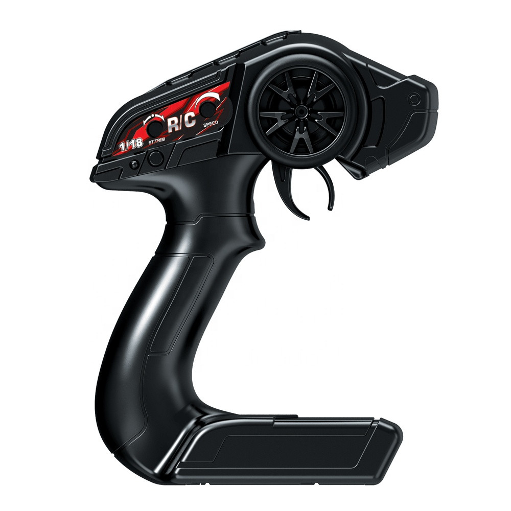 Przemyślany, ergonomiczny nadajnik wyposażony jest w zintegrowaną antenę, trymer układu kierowniczego oraz kontroler umożliwiający elektroniczne ograniczenie prędkości maksymalnej pojazdu. Nadajnik zasilany jest trzema bateriami AA (brak w zestawie). Samochód oferuje bardzo dobre właściwości jezdne i solidne właściwości jezdne w terenie.