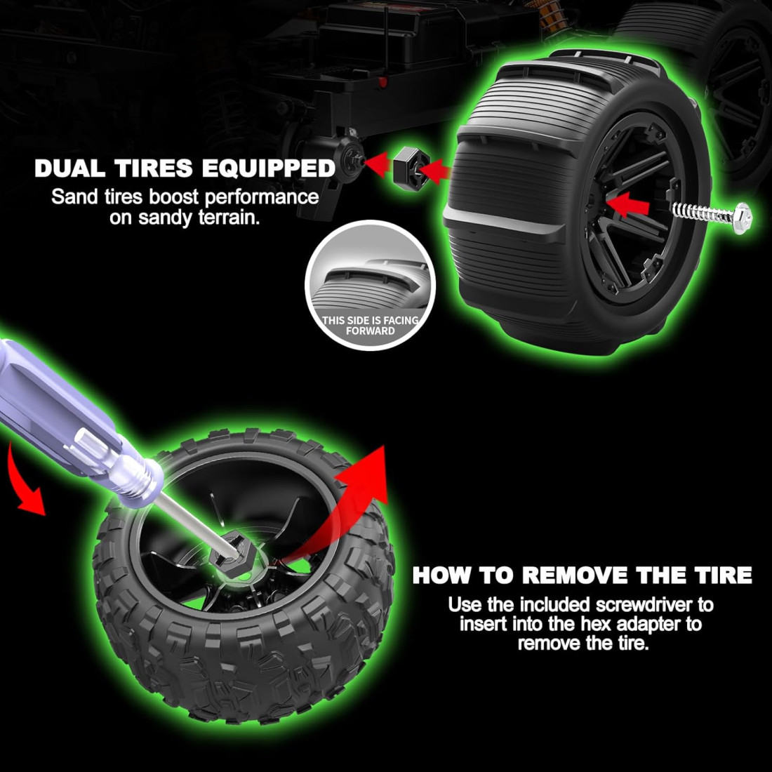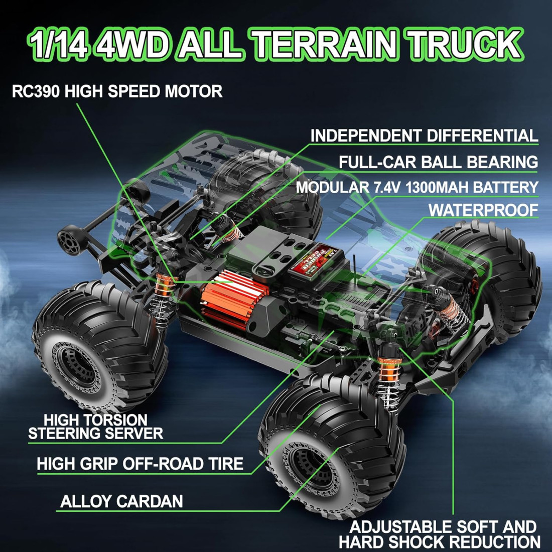 W pełni ukończony zdalnie sterowany model monster trucka w skali 1:14 z napędem na 4 koła i prędkością maksymalną do 40 km/h. Zestaw zawiera nadajnik pistoletowy 2,4 GHz, modułowy akumulator litowo-jonowy 7,4 V o pojemności 1300 mAh oraz ładowarkę USB.