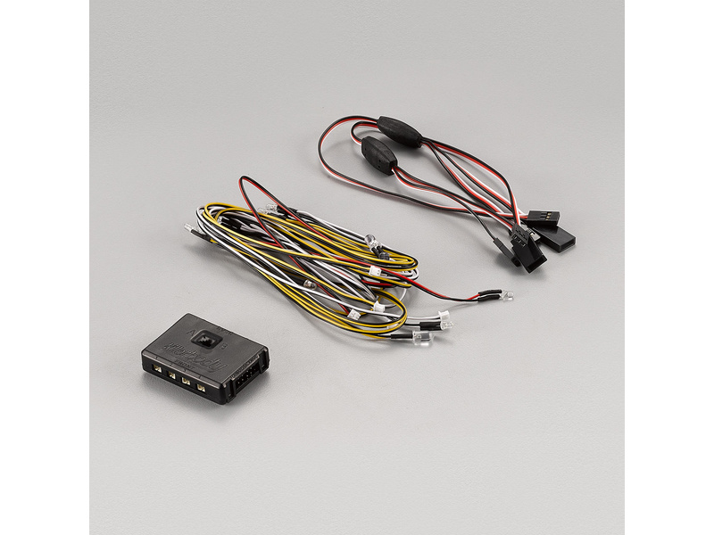 Zawartość zestawu: jednostka sterująca, 2 x 3 pomarańczowe diody LED, 1 x 2 czerwone diody LED, 3 x 2 białe diody LED, 2 kable Y - Rx/serwo, Rx/regulator. Instrukcja oryginalna i czeska.