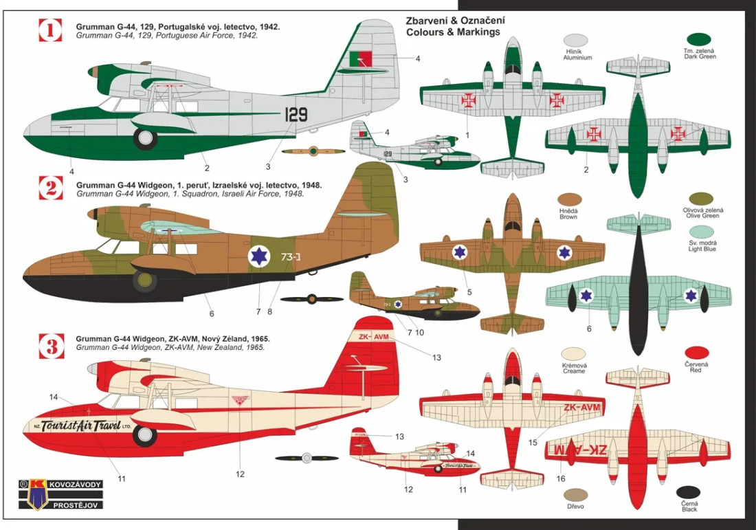 Służba wojskowa Widgeona nie ograniczała się do USA, ponieważ wiele maszyn zostało dostarczonych brytyjskiej Royal Navy i innym krajom alianckim w ramach umowy Lend-Lease. Po wojnie samolot powrócił do sektora cywilnego, gdzie dzięki niezawodności i możliwości lądowania niemal w każdym miejscu stał się ikoną transportu na odległych jeziorach i wodach przybrzeżnych. Zestaw z Kovozávodů Prostějov pozwala szczegółowo przyjrzeć się tej eleganckiej maszynie, w tym starannie wytłoczonym gondolom silnikowym i dużym przeszkleniom kabiny.