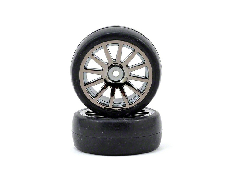 Kompletne uniwersalne koła do samochodów zdalnie sterowanych LATrax Rally w skali 1:18. Felga dwunastoramienna w czarnym chromowanym wykończeniu z przyklejonymi oponami typu slick.