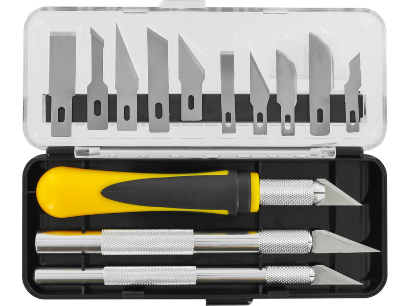 Wyślij zapytanieZestaw noży Modelcraft składający się z 3 części i 13 ostrzy zawiera 3 uchwyty w rozmiarach #1 mały, #2 średni i #5 duży oraz 13 różnych ostrzy. Stosowany do precyzyjnych cięć prostych i krzywych. Dla rzemieślników, modelarzy i profesjonalistów. Zestaw przechowywany jest w praktycznym etui, ostrza na pasku magnetycznym.