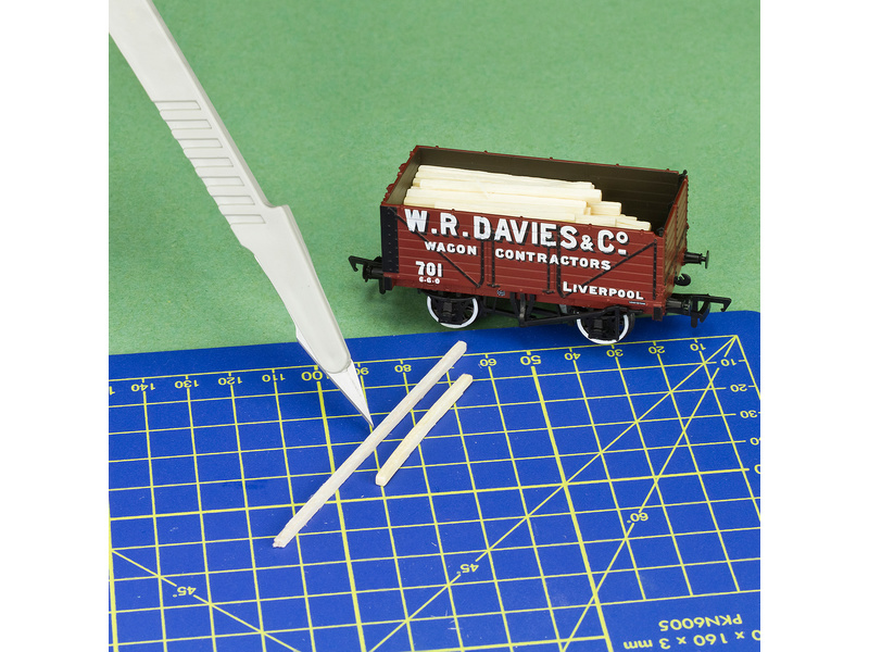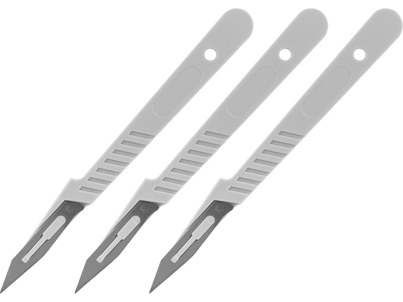 Skalpel modelarski z rękojeścią, 3 sztuki w opakowaniu, do precyzyjnych cięć niezbędnych przy specjalistycznym modelowaniu i pracach typu „zrób to sam”. Posiada uchwyt nylonowy, wbudowaną osłonę palców i zatyczkę zabezpieczającą. Jednorazowego użytku. Długość 150mm, szerokość 15mm.