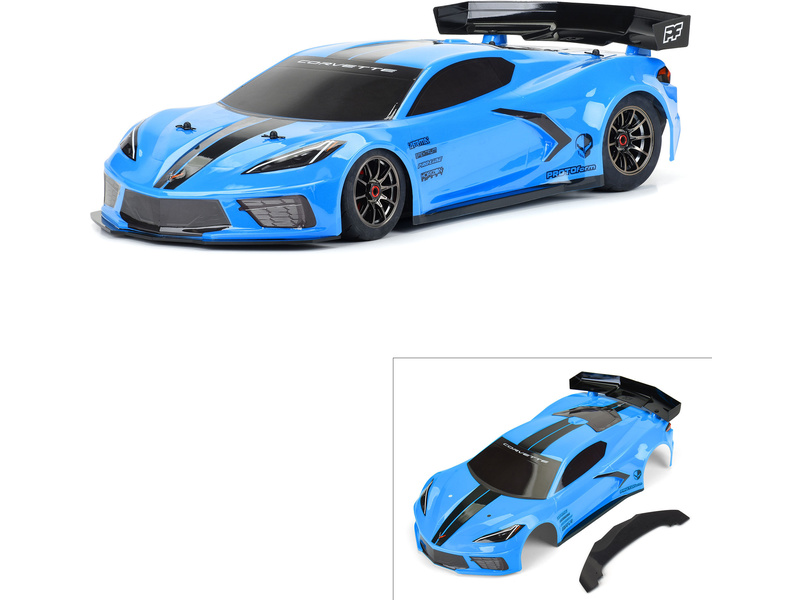 Pakiet zawiera pomalowane na gotowo nadwozie PROTOform Chevrolet Corvette C8 w skali 1:7, przedni spoiler i tylny spoiler.