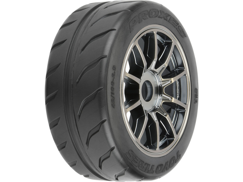 Kompletne koła Pro-Line do modeli samochodów RC 1:7. Rozmiar ⌀100x43 mm. 10-ramienna tarcza Spectre. Licencjonowane opony drogowe Toyo Proxes R888R 2,9" BELTED, twardość mieszanki S3 (miękkie). Kierowca to sześciokąt 17 mm. Wkładka z zamkniętymi komórkami.