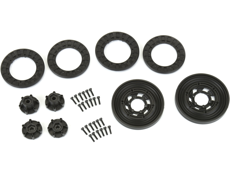 W skład zestawu wchodzą: 2x tarcza, 4x pierścień Beadlock, 24x śruba M3 x 12mm SHCS.