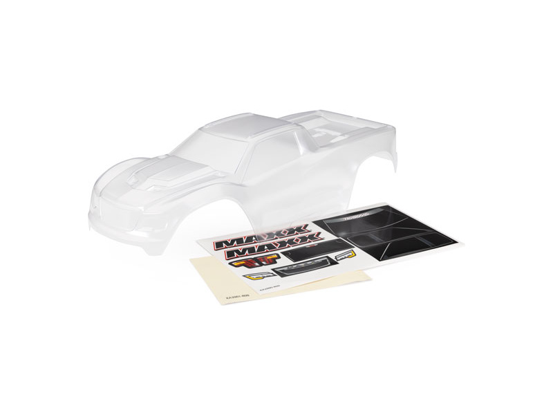 1:8 Traxxas Maxx: Przezroczyste nadwozie (rozstaw osi 352 mm). Nadwozie wymaga pomalowania. W zestawie maski okienne i arkusz naklejek.