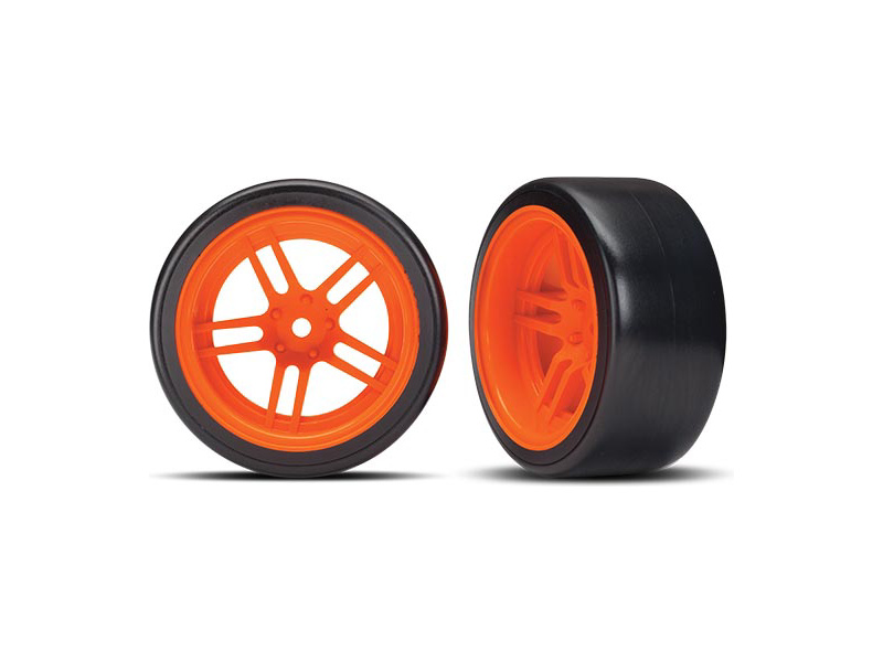 Kompletne koła tylne do modeli samochodów RC Traxxas 4-Tec 2.0. Pomarańczowe koła z rozciętymi szprychami i oponami Drift (2 sztuki w opakowaniu).